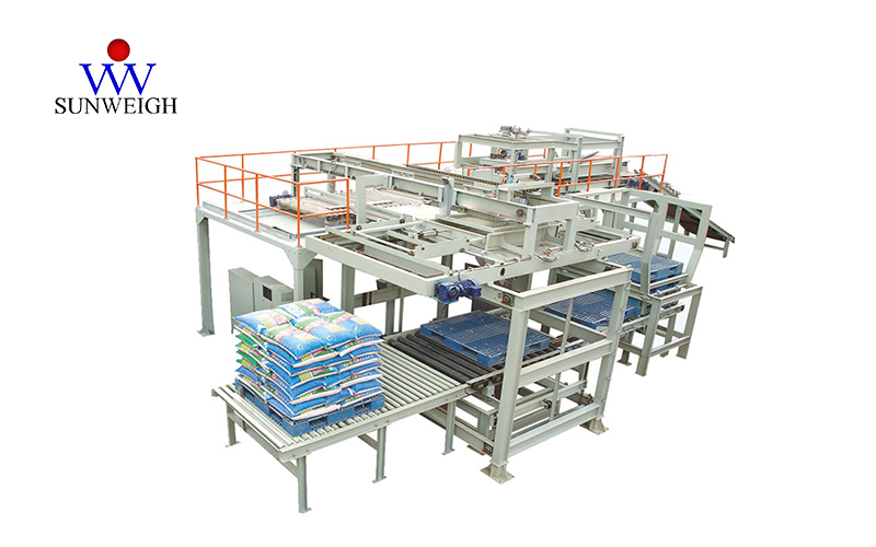 5、堆垛分層升降裝置,通過位置控制實現(xiàn)最大八層包裝袋的堆垛,空托盤自動供給,動作連續(xù)、準確可靠。